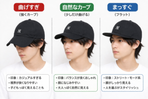つばを強く曲げすぎると、帽子の形が不自然に見えたり、全体の印象が古く見えたりすることがあります。